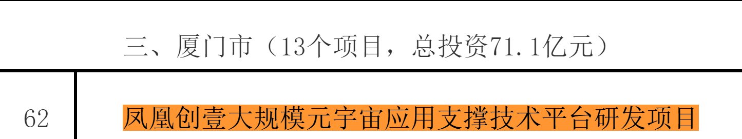 近日,根據(jù)省政府工作部署,為深入開展習(xí)近平新時代中國特色社會主義思想主題教育,持續(xù)拓展“深學(xué)爭優(yōu)、敢為爭先、實干爭效”行動,更大發(fā)揮數(shù)字經(jīng)濟重點項目支撐帶動作用,進一步做大做強做優(yōu)數(shù)字經(jīng)濟,經(jīng)部門地方推薦,省數(shù)字辦遴選確定2023年度省數(shù)字經(jīng)濟重點項目191個,項目總投資1168億元,年度計劃投資260億元。這是我省首次遴選確定年度數(shù)字經(jīng)濟重點項目。廈門市有鳳凰創(chuàng)壹大規(guī)模元宇宙應(yīng)用支撐技術(shù)平臺研發(fā)項目等13個項目列入,總投資71.1億元。