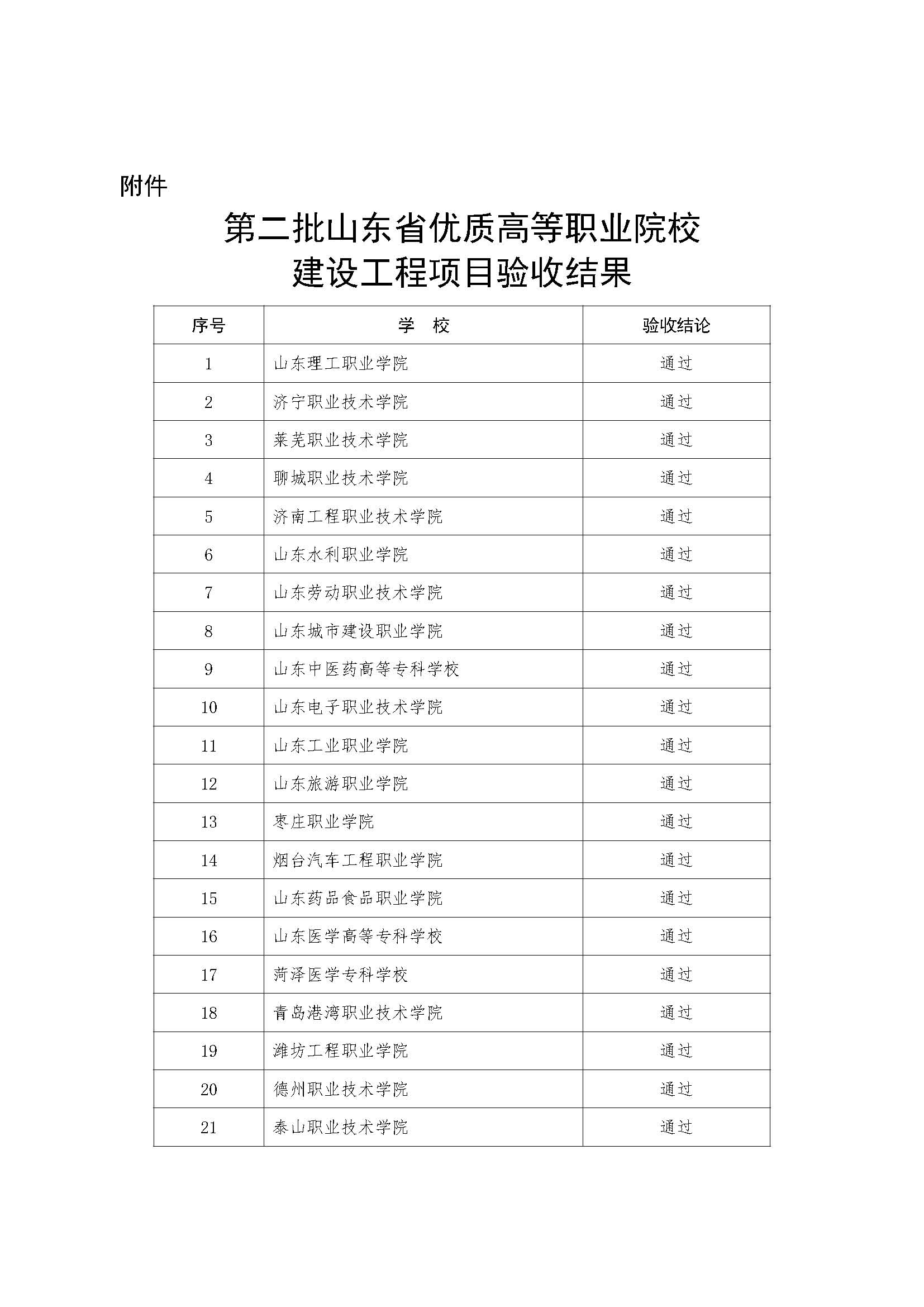 根據(jù)山東省優(yōu)質(zhì)高等職業(yè)院校建設(shè)工程實(shí)施管理規(guī)定,在學(xué)校自評(píng)、項(xiàng)目審計(jì)基礎(chǔ)上,我廳組織專家采取現(xiàn)場(chǎng)評(píng)估方式,對(duì)第二批立項(xiàng)建設(shè)的省優(yōu)質(zhì)高職院校進(jìn)行了驗(yàn)收。按照《山東省教育廳 山東省財(cái)政廳關(guān)于實(shí)施山東省優(yōu)質(zhì)高等職業(yè)院校建設(shè)工程的通知》(魯教職字〔2017〕4號(hào))相關(guān)規(guī)定,依據(jù)專家驗(yàn)收結(jié)果,21所立項(xiàng)建設(shè)的第二批省優(yōu)質(zhì)高職院校全部驗(yàn)收通過(guò),授予“山東省優(yōu)質(zhì)高等職業(yè)院校”稱號(hào)。驗(yàn)收結(jié)果經(jīng)公示無(wú)異議,現(xiàn)予以公布(見(jiàn)附件)。