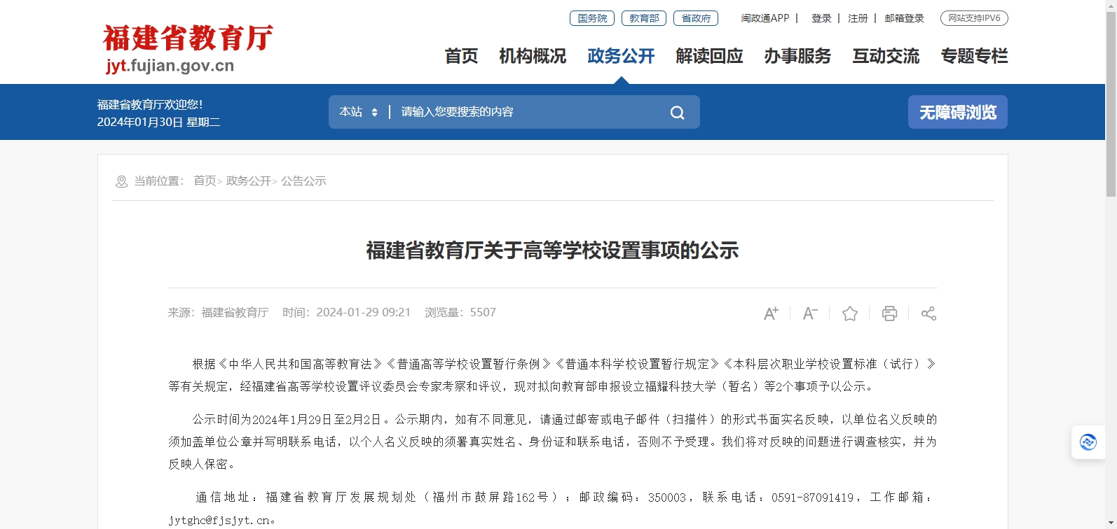 2024年1月29日,福建省教育廳官方網(wǎng)站發(fā)布《福建省教育廳關(guān)于高等學校設置事項的公示》。公示中稱,根據(jù)《中華人民共和國高等教育法》《普通高等學校設置暫行條例》《普通本科學校設置暫行規(guī)定》《本科層次職業(yè)學校設置標準(試行)》等有關(guān)規(guī)定,經(jīng)福建省高等學校設置評議委員會專家考察和評議,現(xiàn)對擬向教育部申報設立福耀科技大學(暫名)等2個事項予以公示。