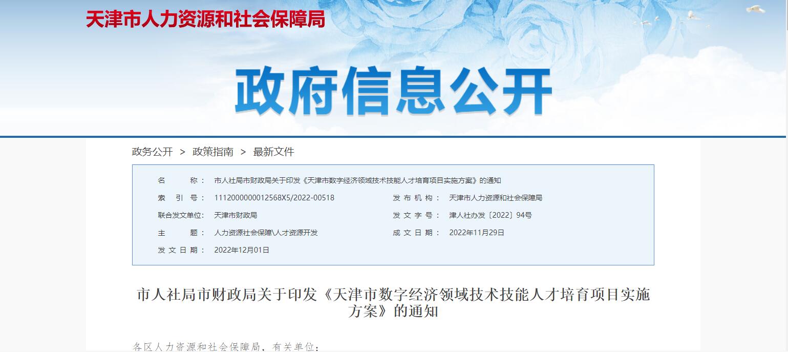 為強化現(xiàn)代化建設(shè)人才支撐,促進數(shù)字經(jīng)濟和實體經(jīng)濟深度融合,近日,天津市人社局、財政局聯(lián)合發(fā)布數(shù)字經(jīng)濟領(lǐng)域技術(shù)技能人才培育項目實施方案。